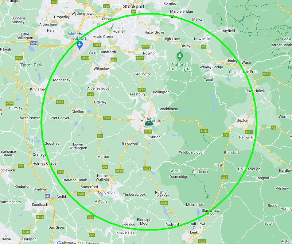 Open the map for our shop location — below is an overview of our delivery limits (rings are straight-line from the shop; online checkout uses the same 5 / 10 mile rules and may measure by road when Google Maps is enabled on our server).